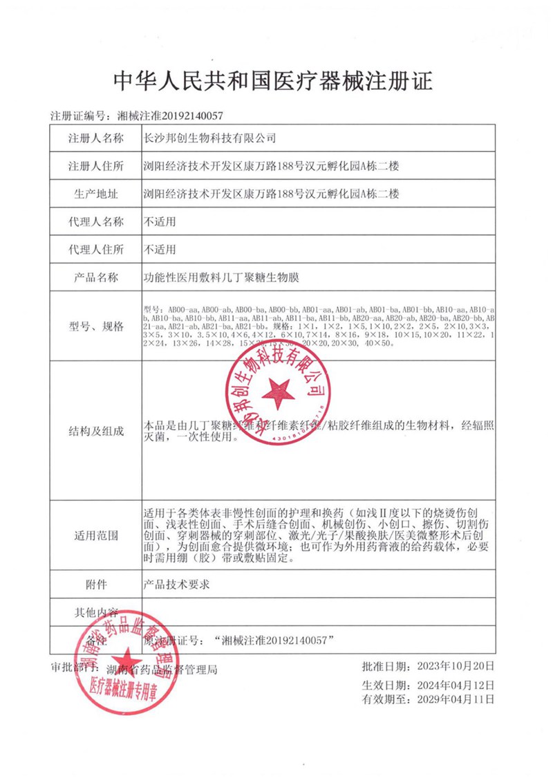 功能性醫(yī)用敷料幾丁聚糖生物膜注冊(cè)證