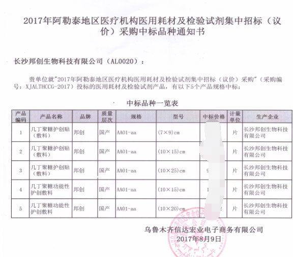 恭賀我公司產(chǎn)品在2017年新疆阿勒泰醫(yī)用耗材招標(biāo)采購項(xiàng)目中標(biāo)